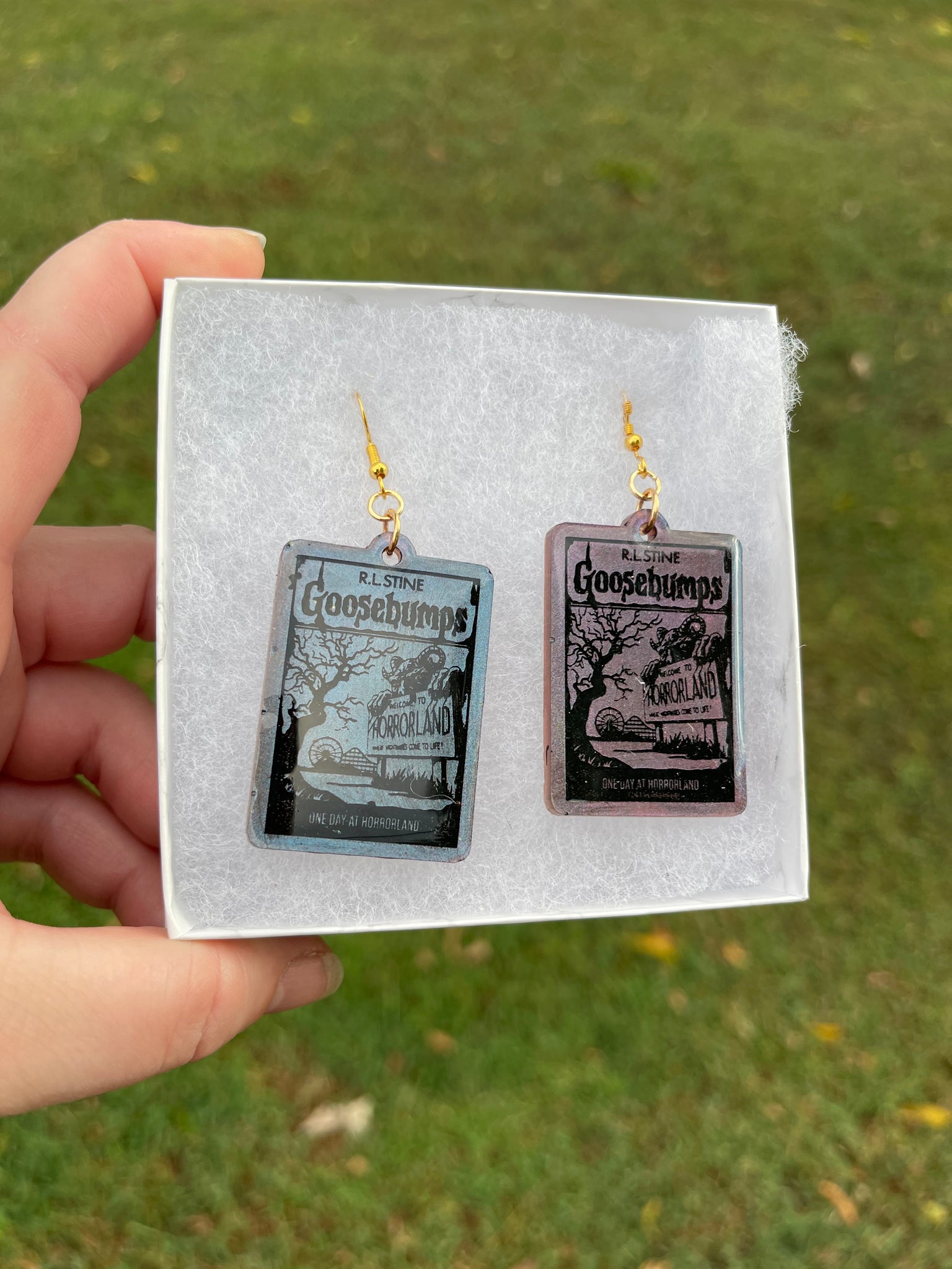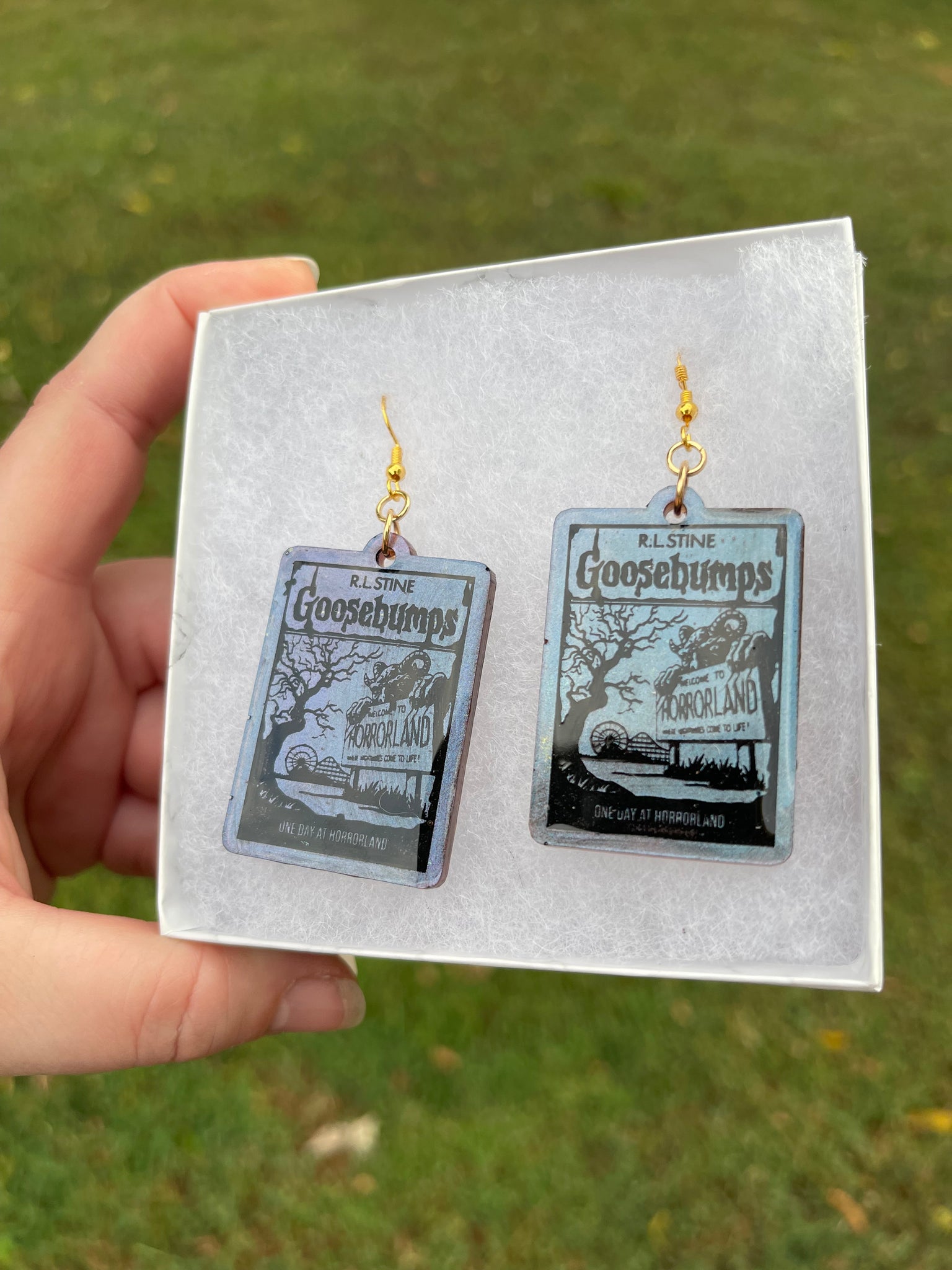 These blue / purple Goosebumps Welcome to Horrorland earrings were made by Darci McFarland with epoxy resin. They are one-of-kind, and the hooks are 925 sterling silver.