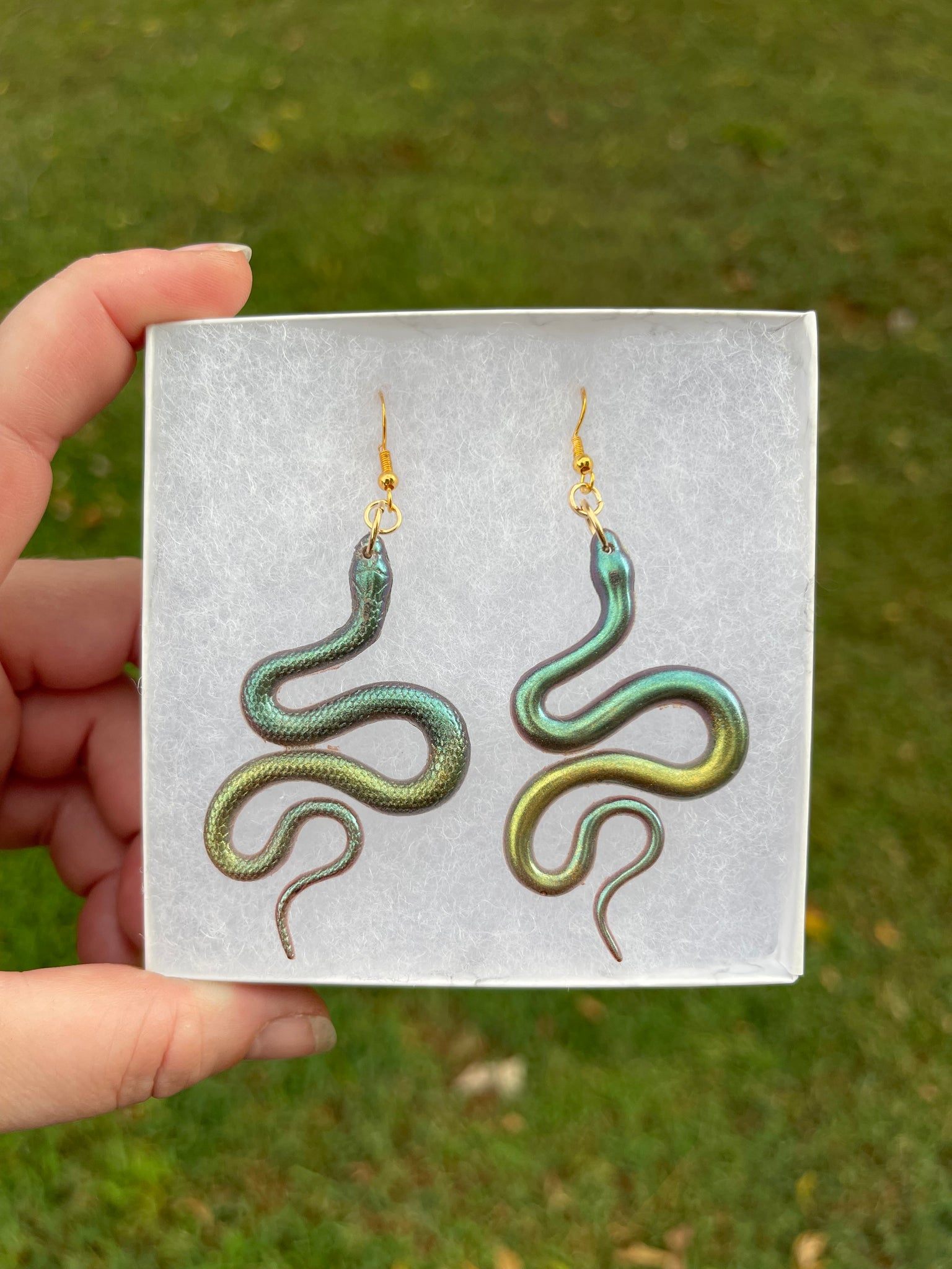 One-of-a-kind green snake earrings made by Darci McFarland with epoxy resin. Hooks are 925 sterling silver.
