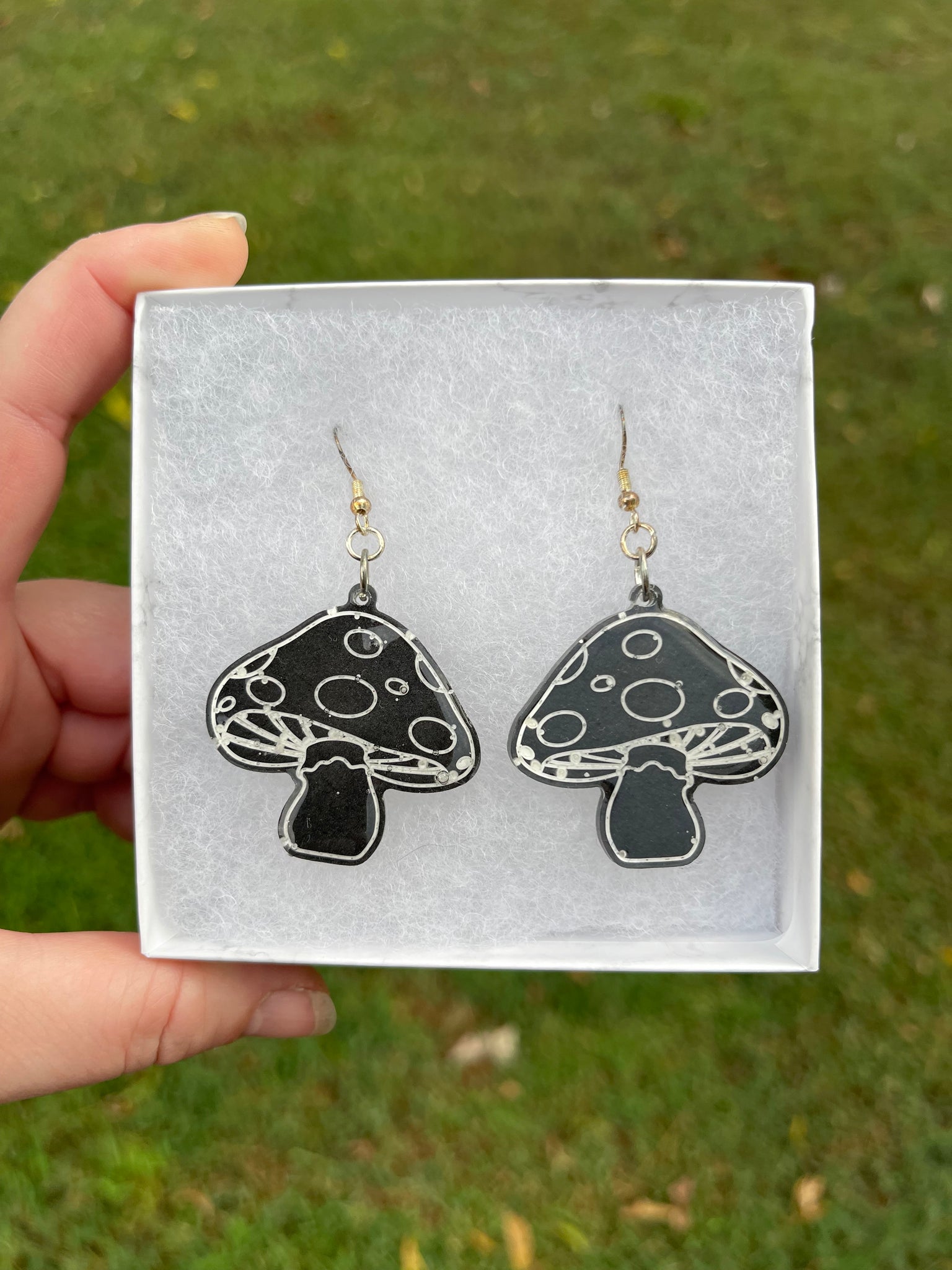 Black mushroom earrings made by Darci McFarland with epoxy resin. Each set of earrings is one of a kind, and the hooks are 925 Sterling Silver.