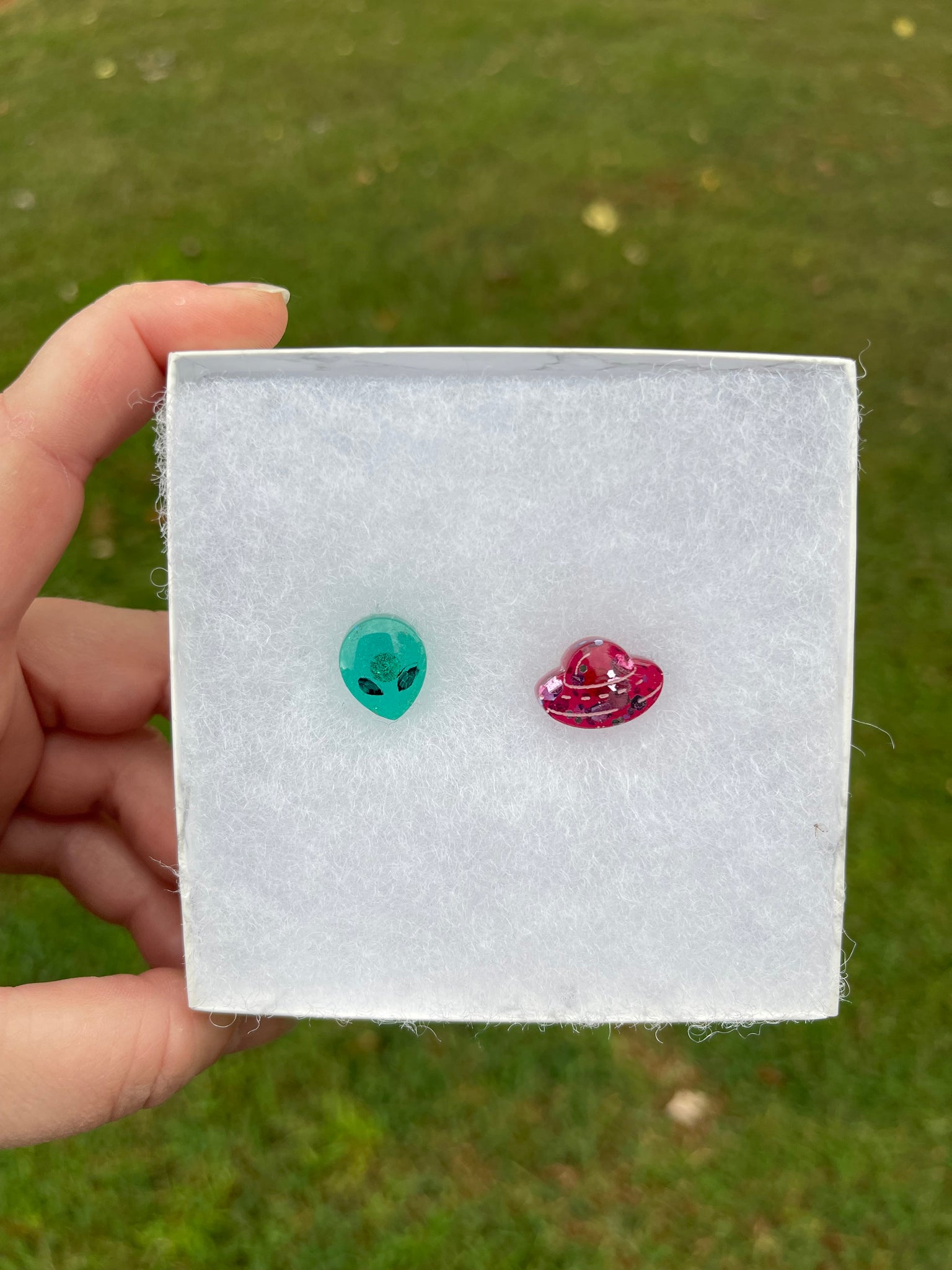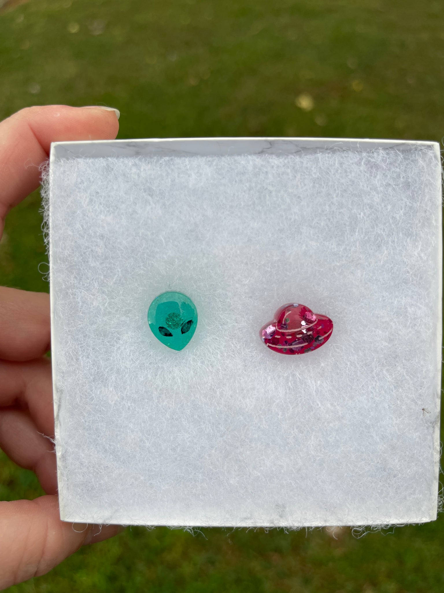 These teal & pink alien & UFO earrings were made by Darci McFarland with epoxy resin. They are one-of-kind, and the posts are nickel & lead free.
