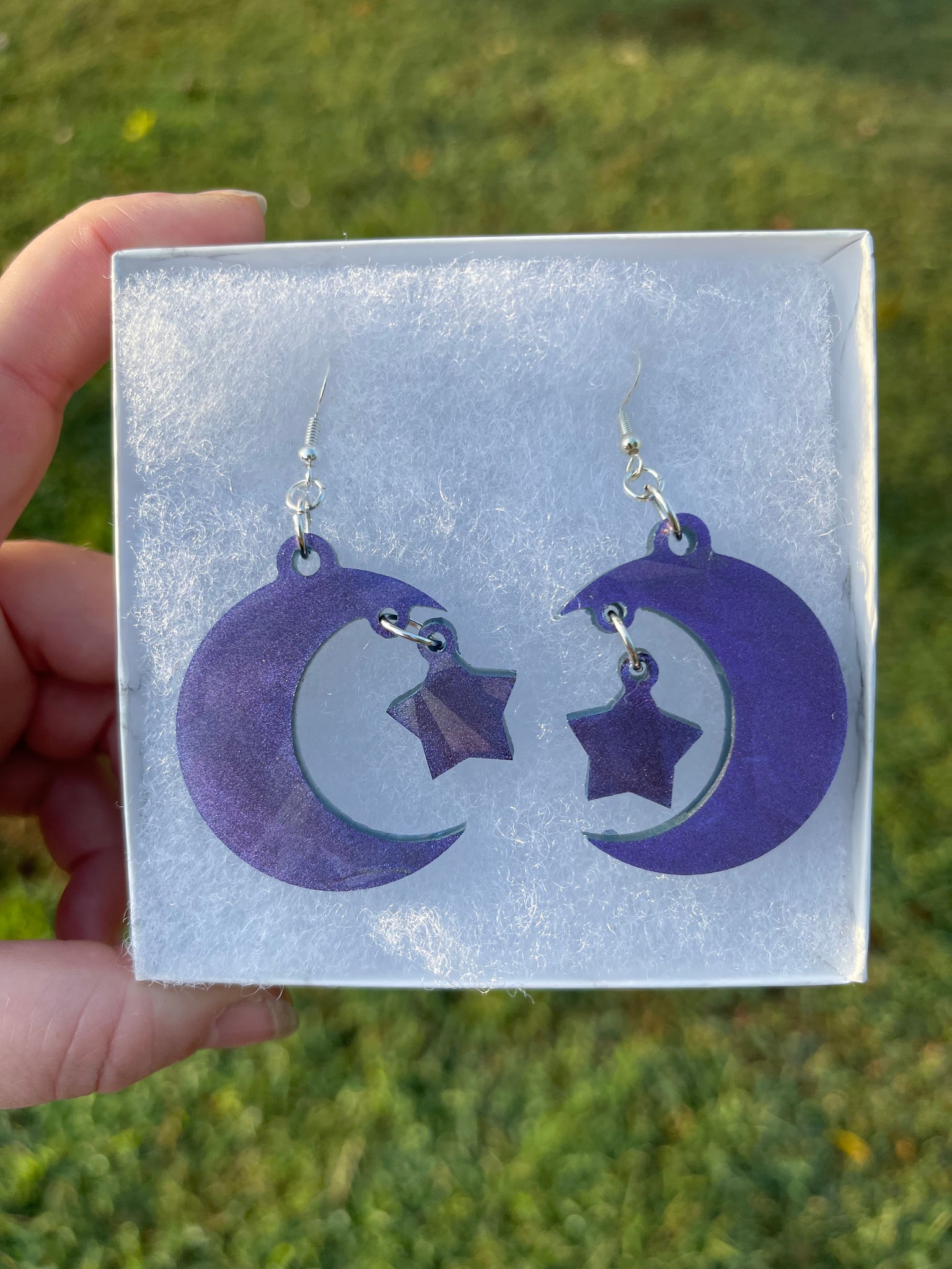 These purple holographic moon & star earrings were made by Darci McFarland with epoxy resin. They are one-of-kind, and the hooks are 925 sterling silver.