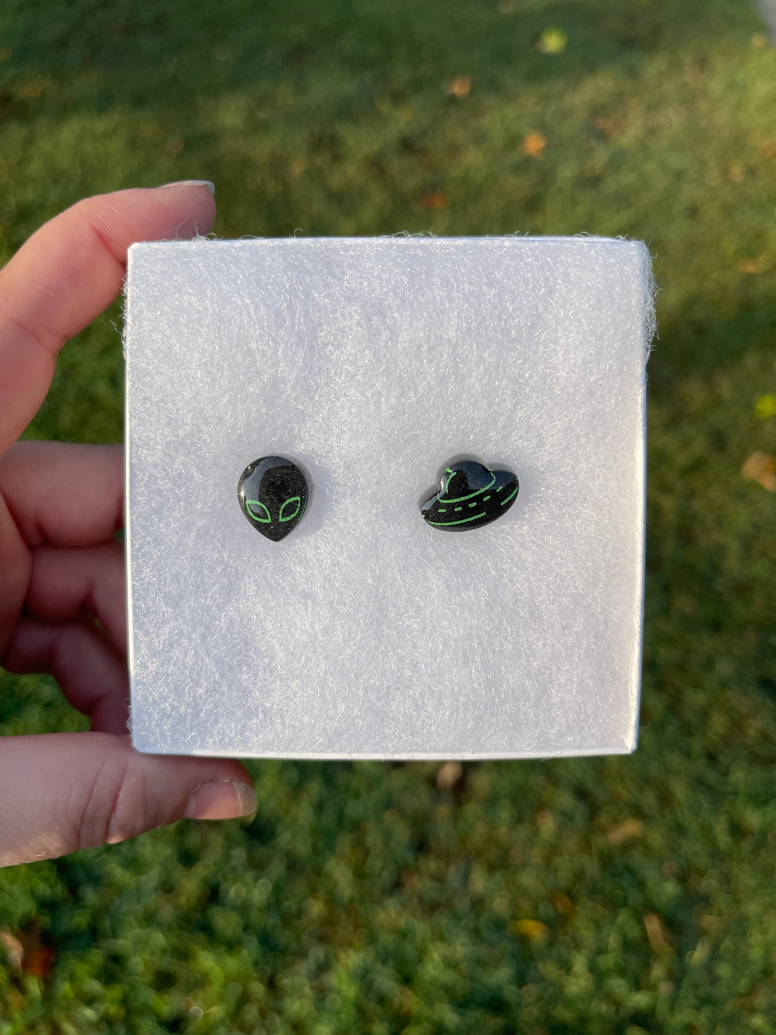 These black & green alien & UFO earrings were made by Darci McFarland with epoxy resin. They are one-of-kind, and the posts are nickel & lead free.