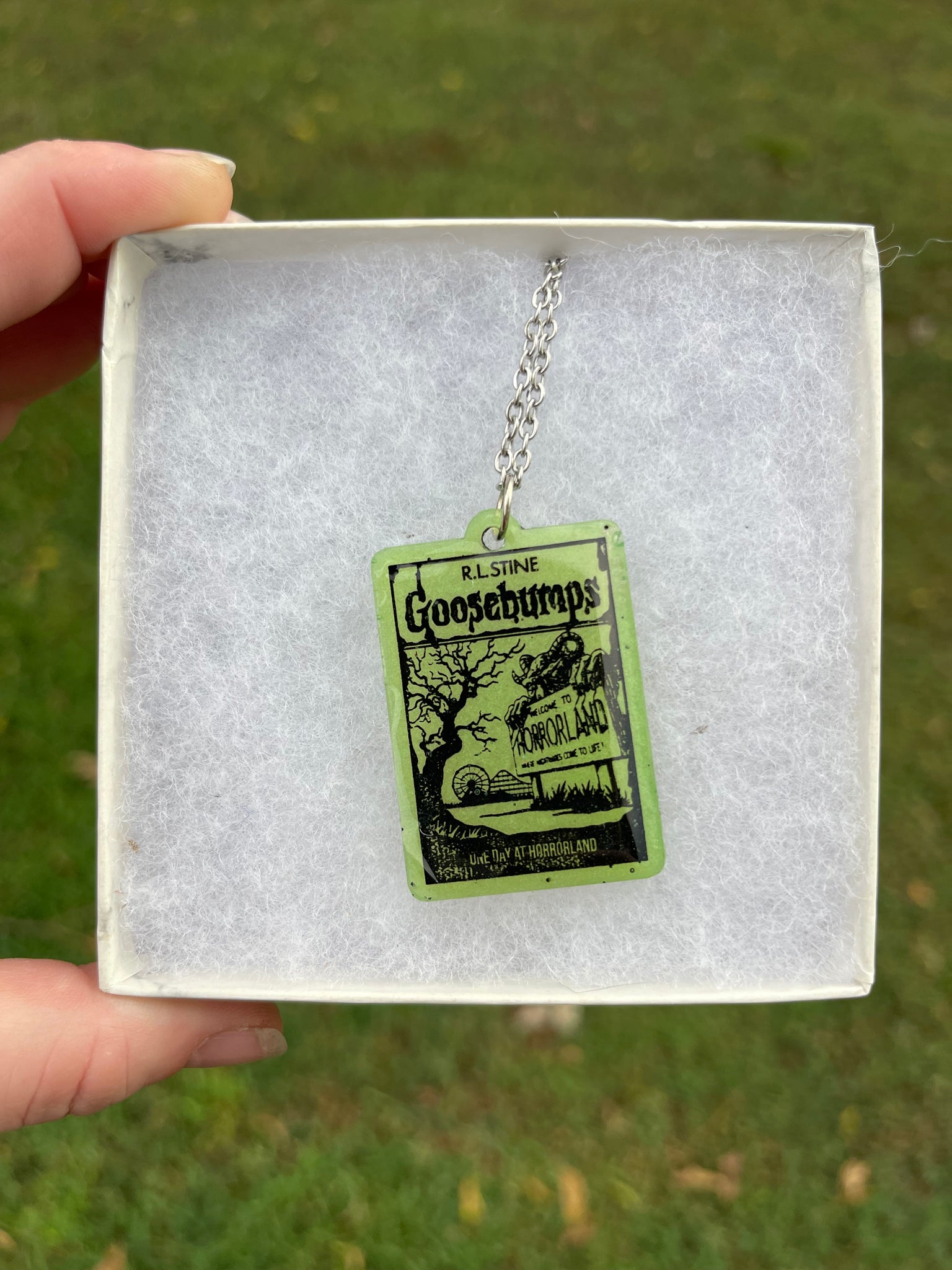 This green Goosebumps Welcome to Horrorland necklace was made by Darci McFarland with epoxy resin. ITy’s one-of-kind, and the chain is stainless steel.