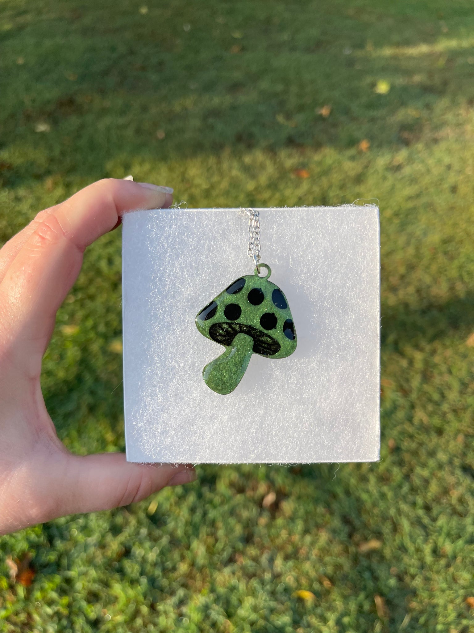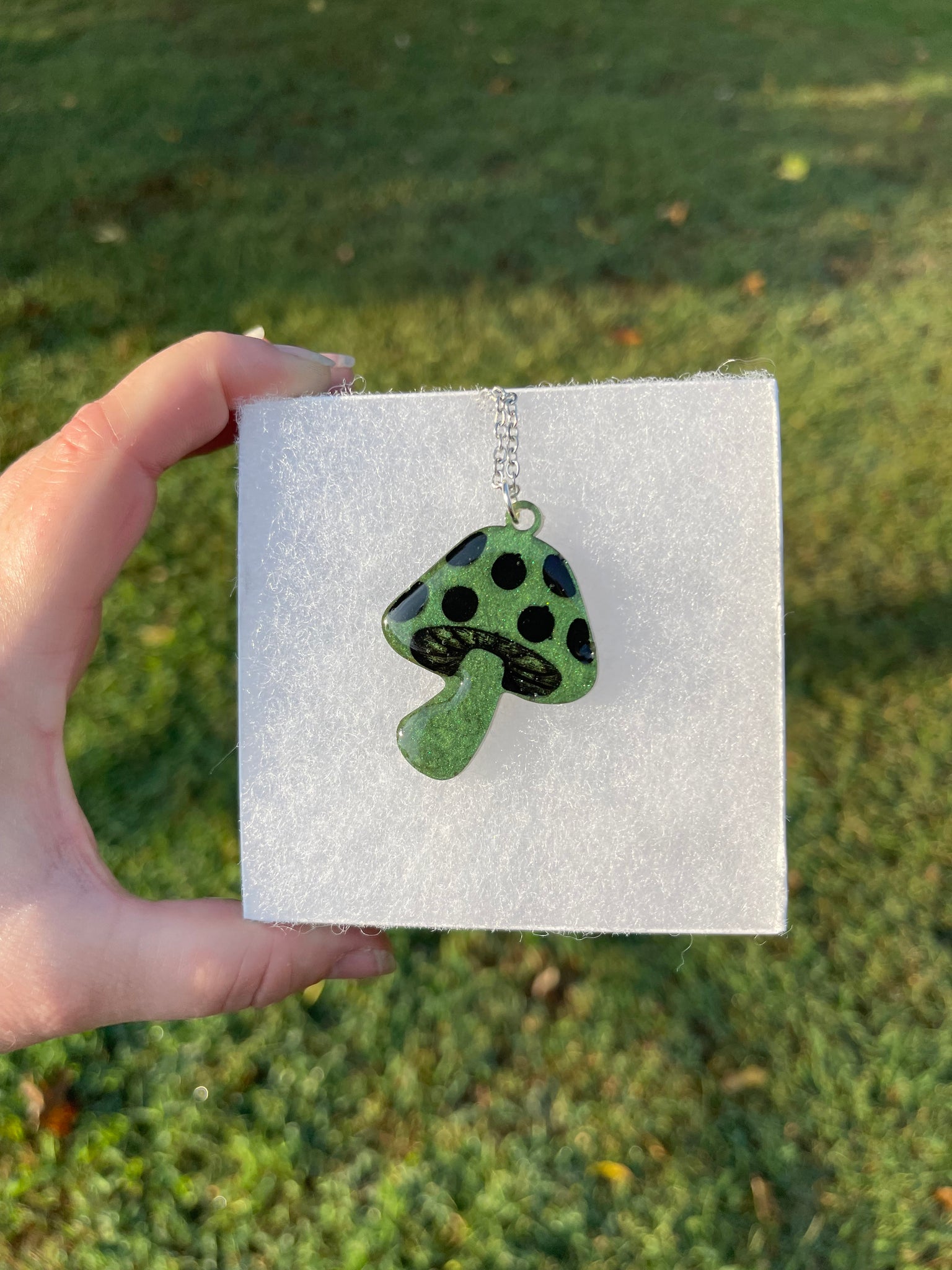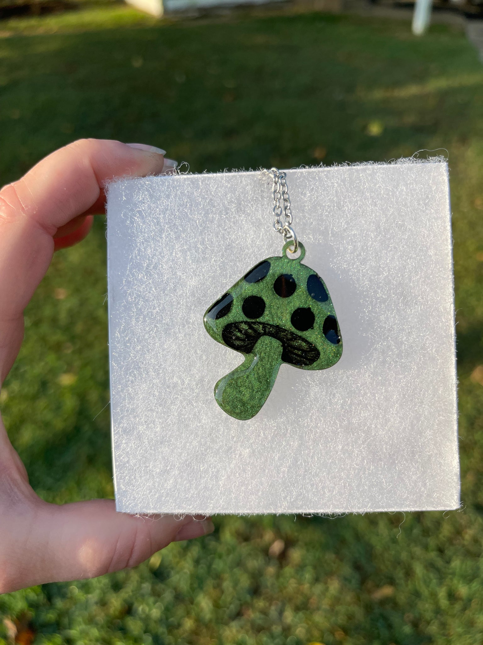 This green mushroom necklace was made by Darci McFarland with epoxy resin. It’s one-of-kind, and the chain is stainless steel.