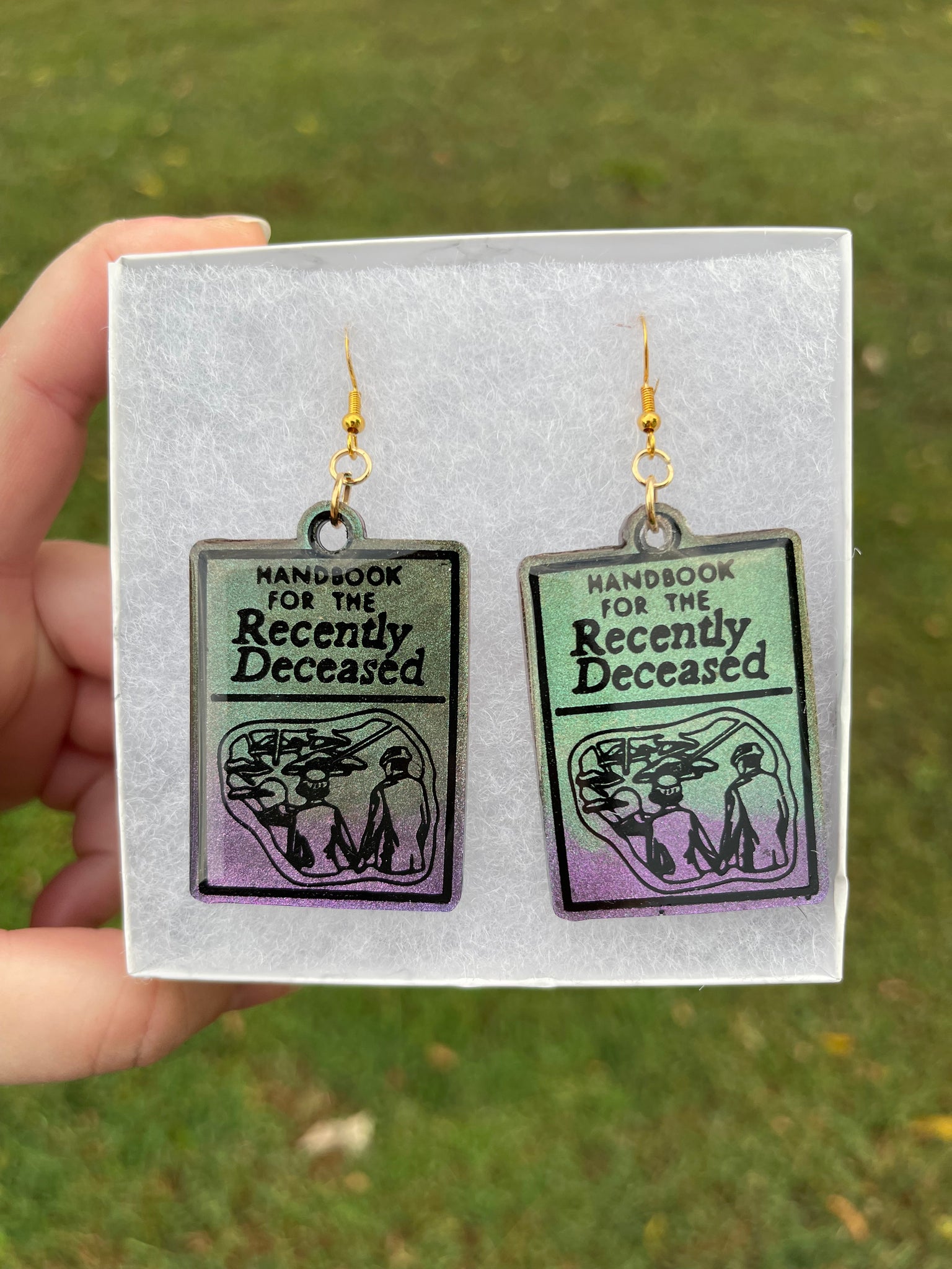 These green & purple Handbook of the Recently Deceased earrings were made by Darci McFarland with epoxy resin. They are one-of-kind, and the hooks are 925 sterling silver.