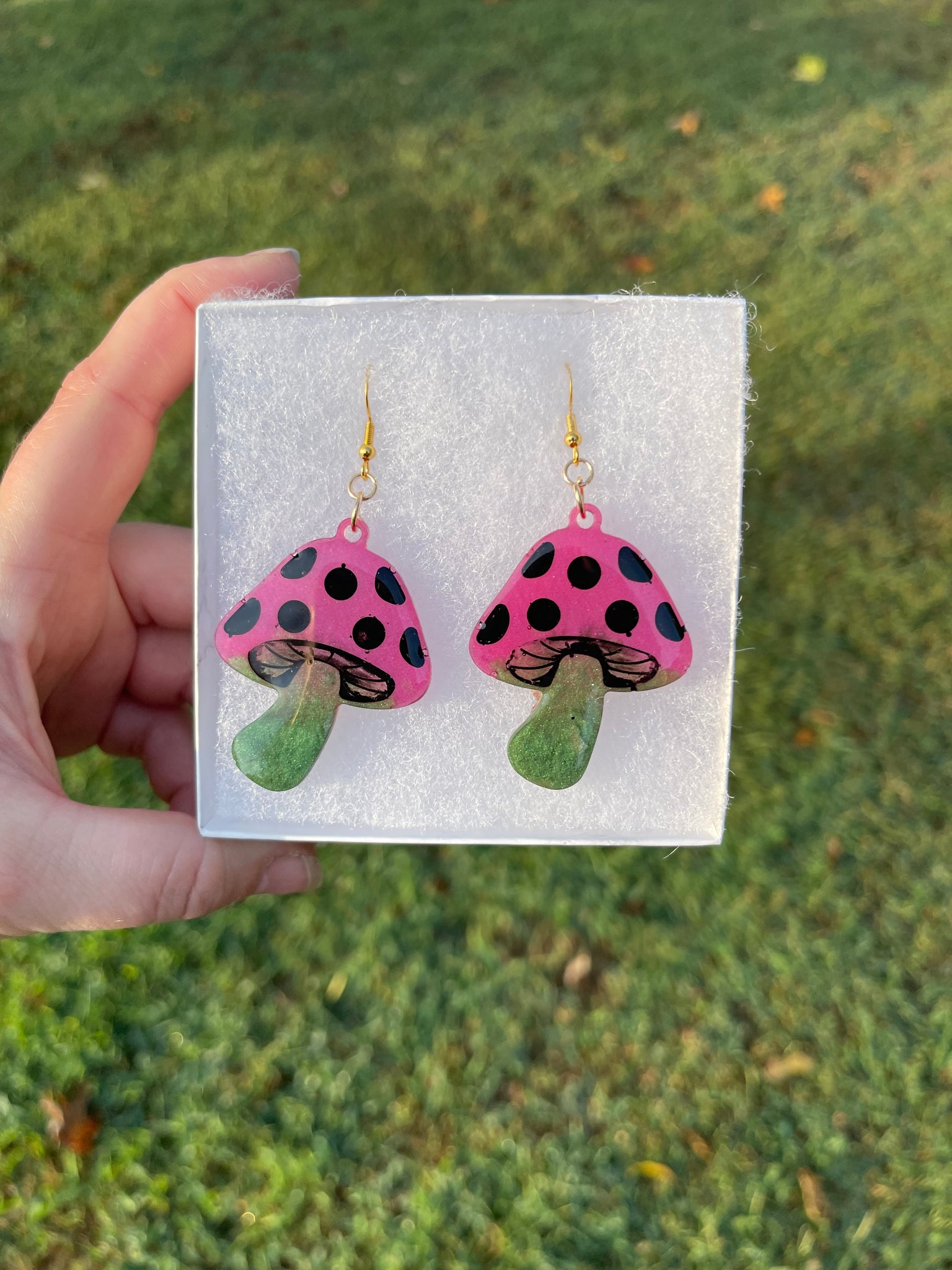 Large dark green & pink mushroom earrings made by Darci McFarland with epoxy resin. Each set of earrings is one of a kind, and the hooks are 925 Sterling Silver.