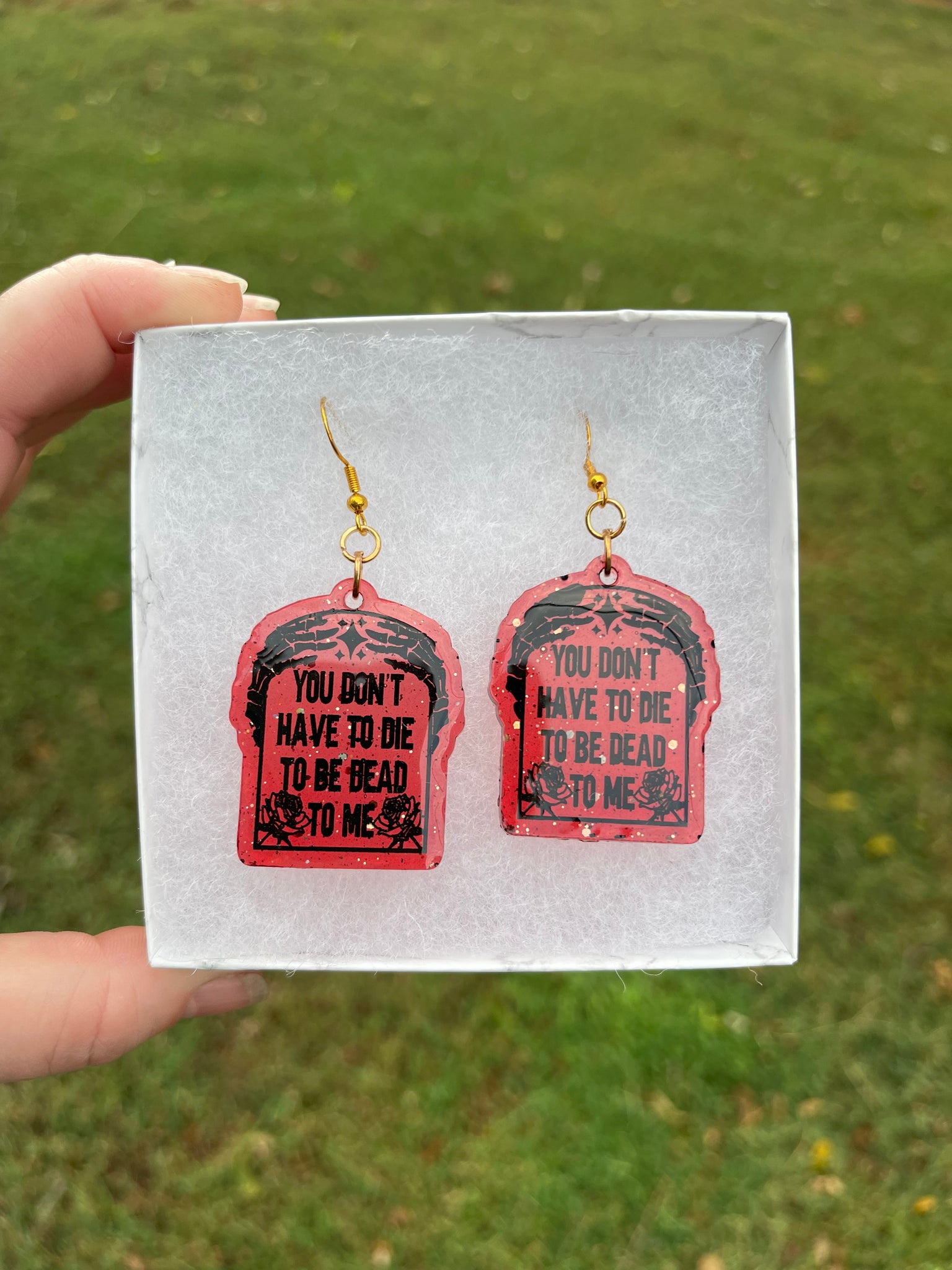 These red You Don’t Have to Die to be Dead to Me earrings were made by Darci McFarland with epoxy resin. They are one-of-kind, and the hooks are 925 sterling silver.